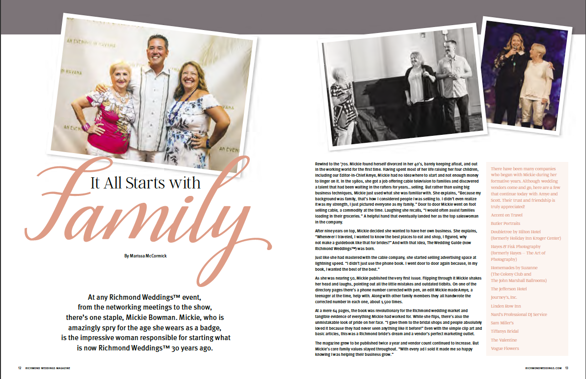 But with its growth, Mickie’s presence and influence have always been there. Richmond Weddings™ is the success it is now because of the work and dedication that Mickie put in and passed along to Amye and Scott. Here we give hugs instead of handshakes and treat everyone like family. Why? Because that’s the way Mickie did it.