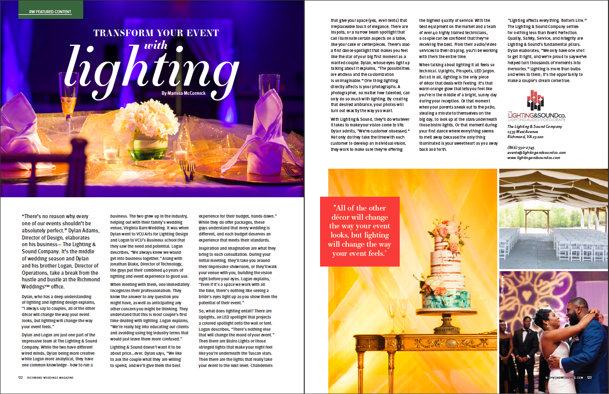“There’s no reason why every one of our events shouldn’t be absolutely perfect.” Dylan Adams, Director of Design, elaborates on his business – The Lighting & Sound Company (LSC). It’s the middle of wedding season and Dylan and his brother Logan, Director of Operations, take a break from the hustle and bustle at the Richmond Weddings™ office.