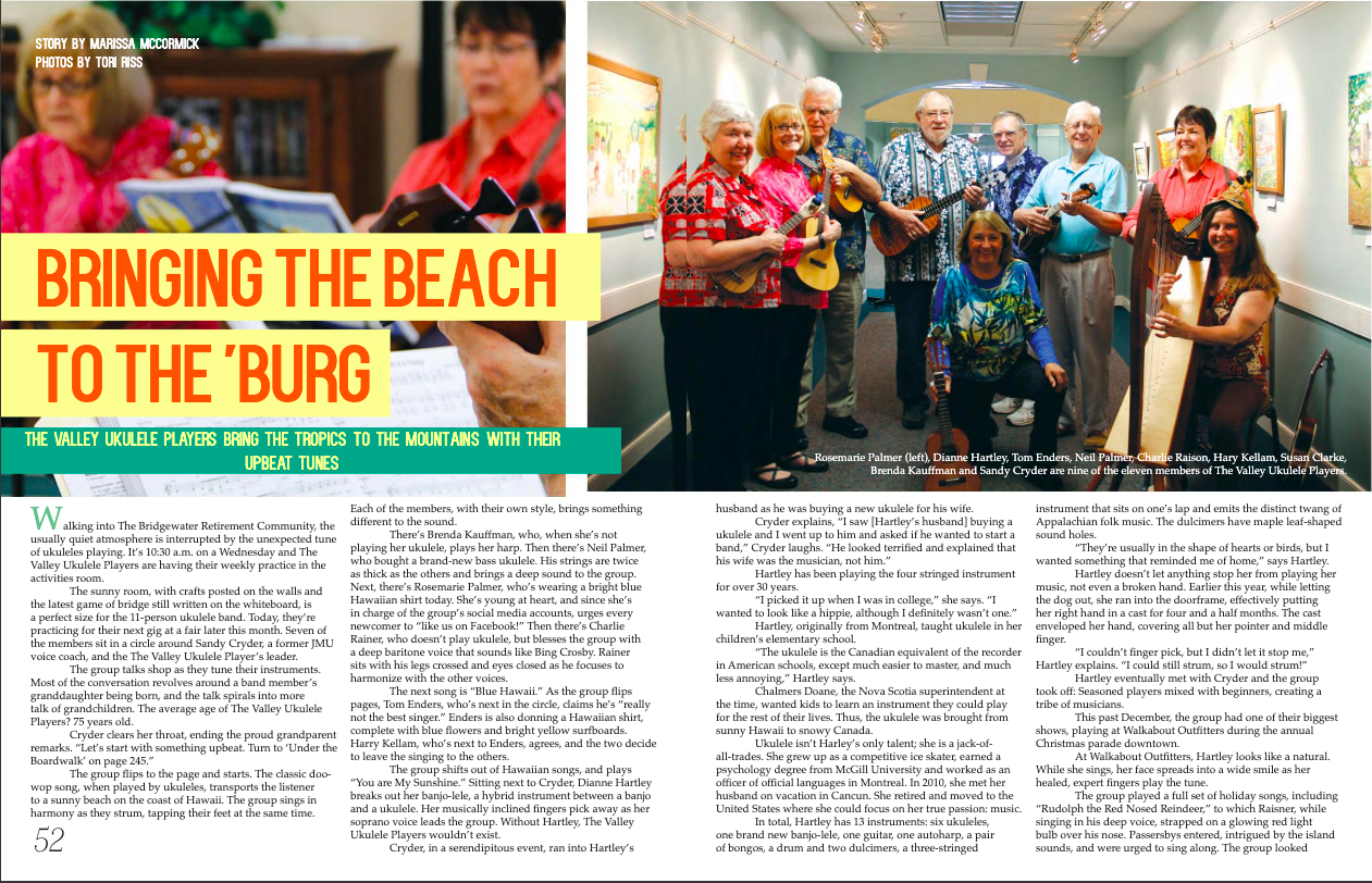 The sunny room, with crafts pasted on the walls and the latest game of bridge still written on the whiteboard, is a perfect size for the eleven-person ukulele band. Today, they’re practicing for their next gig at a fair later this month. Seven of the members sit in a circle around Sandy Cryder, a former JMU voice coach, and The Valley Ukulele Player’s fearless leader.